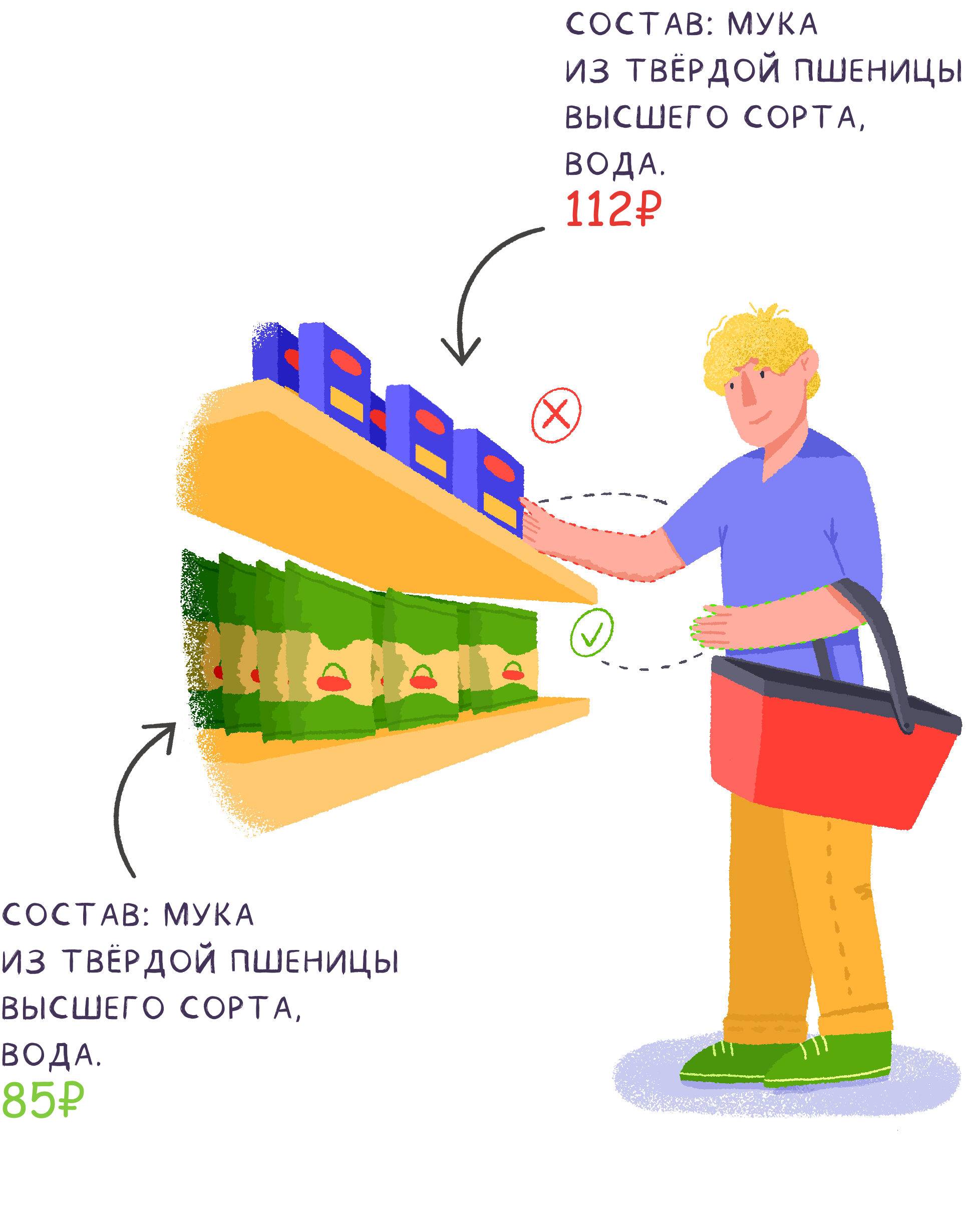 Лучше обращать внимание на товары, которые расположены слева от вас на верхних или нижних полках, и поискать там аналоги дорогого продукта. Важно сравнить состав и вес, ведь часто при большой разнице в цене он у продуктов одинаковый, и можно найти товары с оптимальным соотношением «цена-качество».