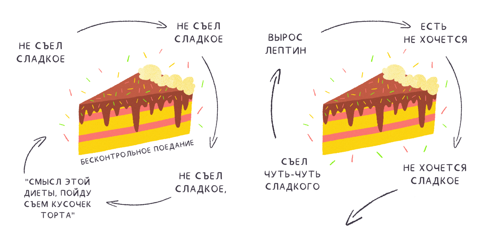 лептина. Это гормон, который влияет на аппетит и метаболизм и снижается из‑за похудения и дефицита калорий. Низкий лептин заставляет жаждать еды так, что удержаться на диете становится сложнее, а набрать вес после срыва — проще.