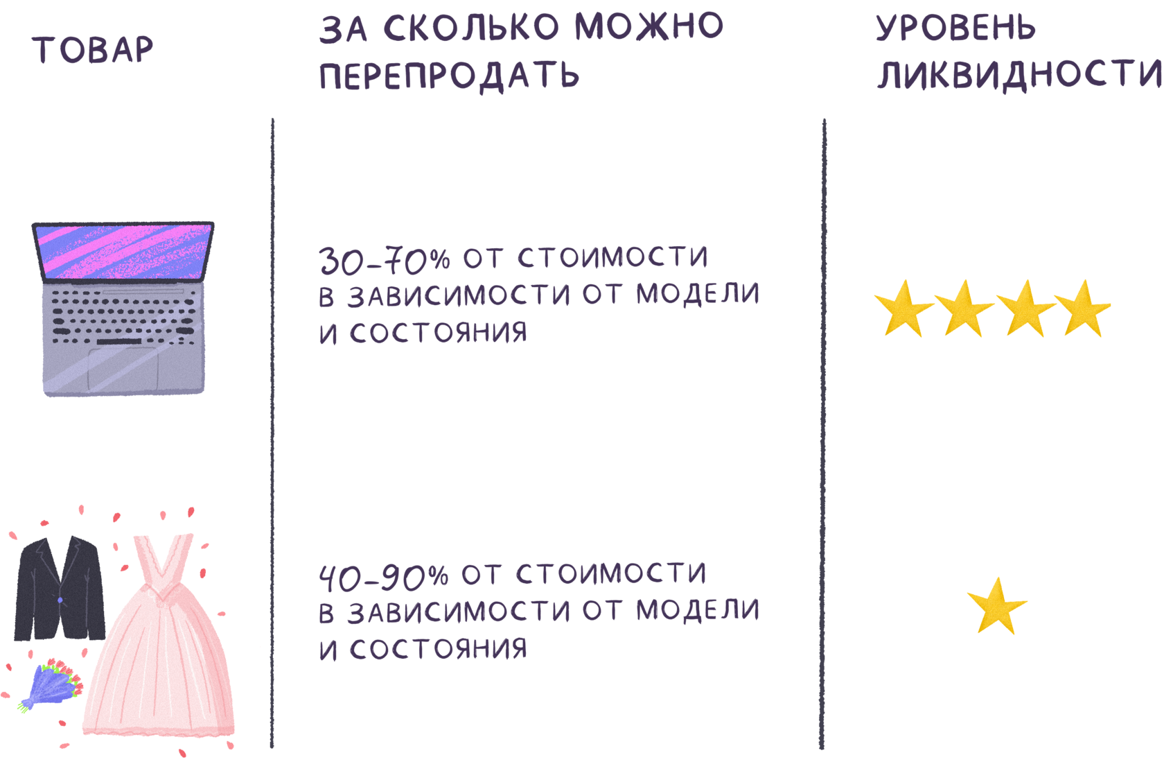 Если такие объявления есть, цена на б/у составляет 50−70% от магазинной и их быстро покупают, значит у товара высокая ликвидность. Так что взять пылесос в кредит можно — даже если вдруг у Ивановых резко сократится доход, они смогут его быстро перепродать и погасить долг.