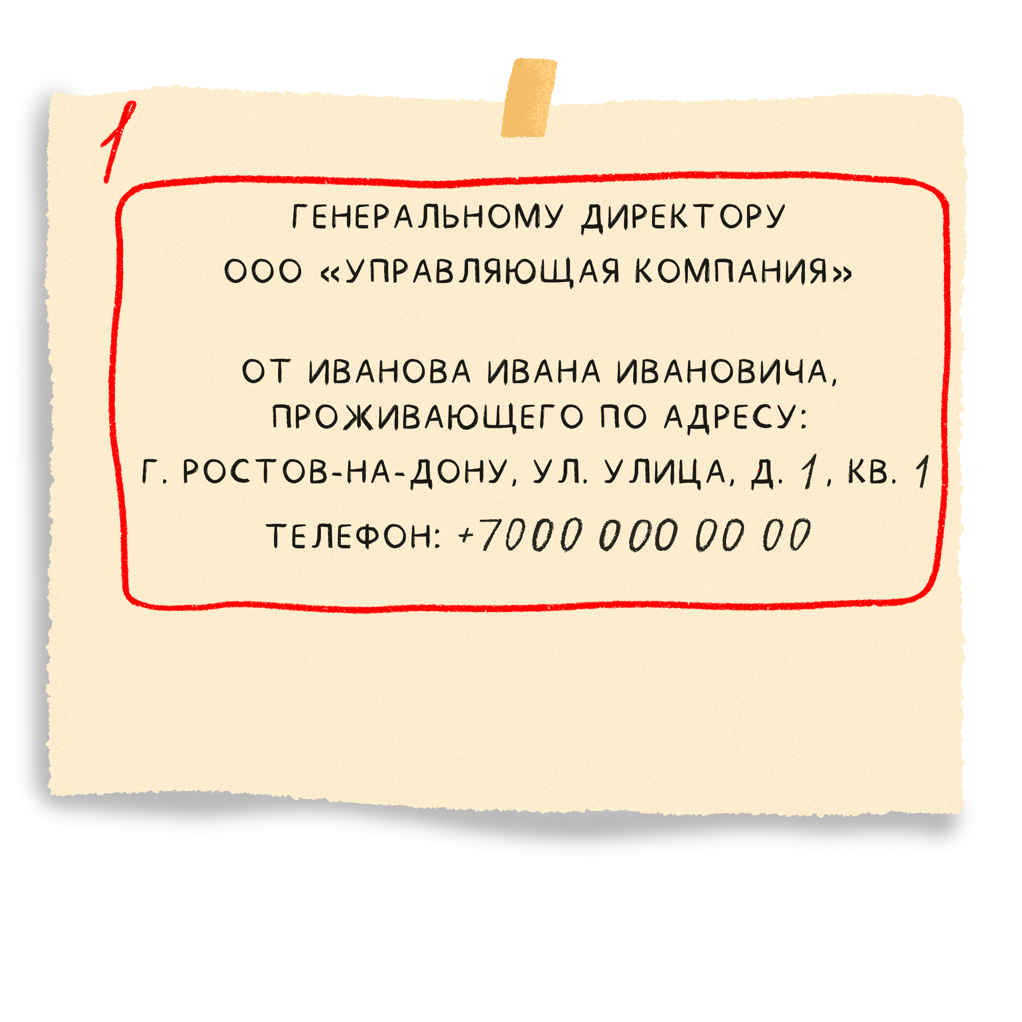 Эта часть отвечает на вопросы «Кому?» и «От кого?» В шапке необходимо указать, кому направлено заявление, название управляющей компании. А также Ф. И. О. заявителя или заявителей, если недовольных ситуацией жильцов несколько, адреса проживания, электронной почты и телефоны каждого из них.