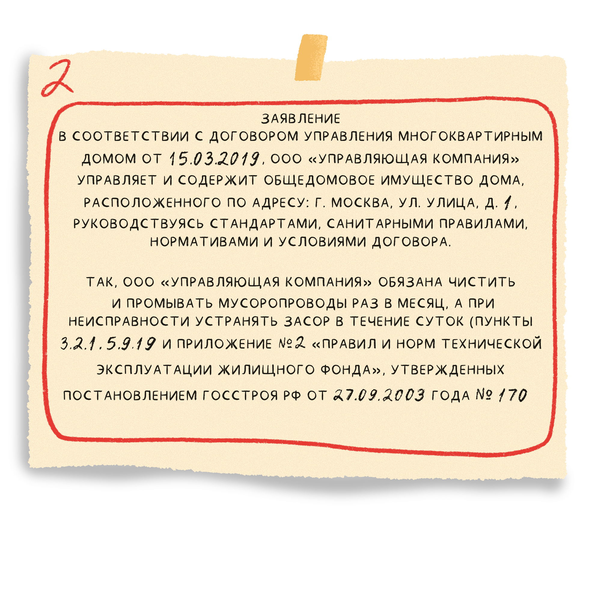 В основной части заявления хватит и простого описания проблемы, но если вы хотите добавить требованиям веса, можно сослаться на договор с управляющей компанией или указать подходящие нормативные акты. В них можно найти информацию о сроках и регулярности ремонта, влажной уборки, очистки мусоропровода, состояния электрики, водопровода, отопления или нормативы расчёта коммунальных платежей. Здесь вы можете посмотреть их.