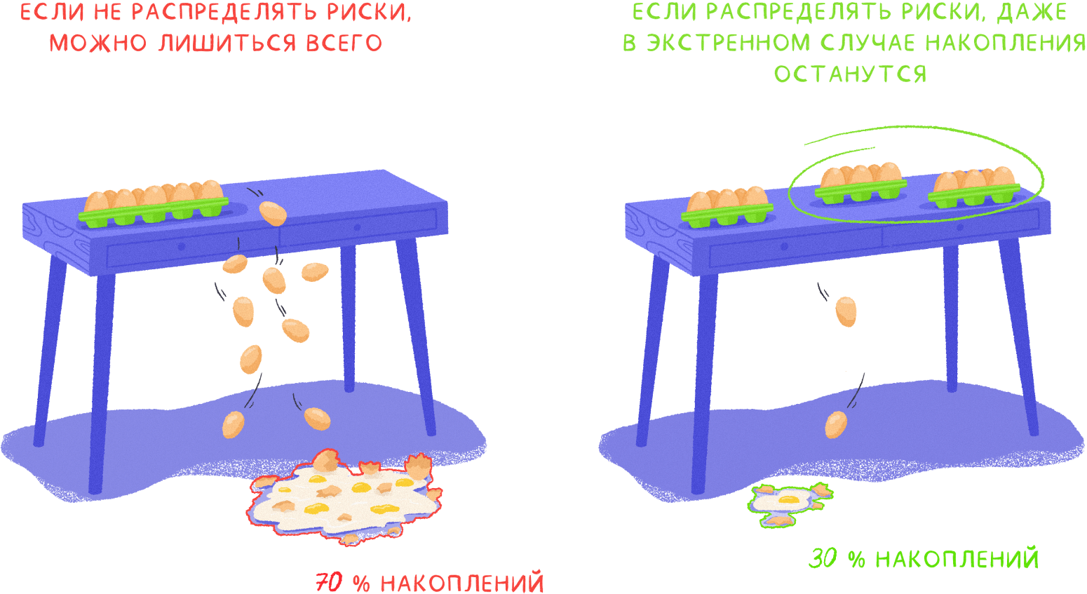 Для этого нужно обязательно разделить их по разным финансовым инструментам, а не держать в рублях наличными дома. Это называется диверсифицировать риски. Сделать это можно следующим образом: