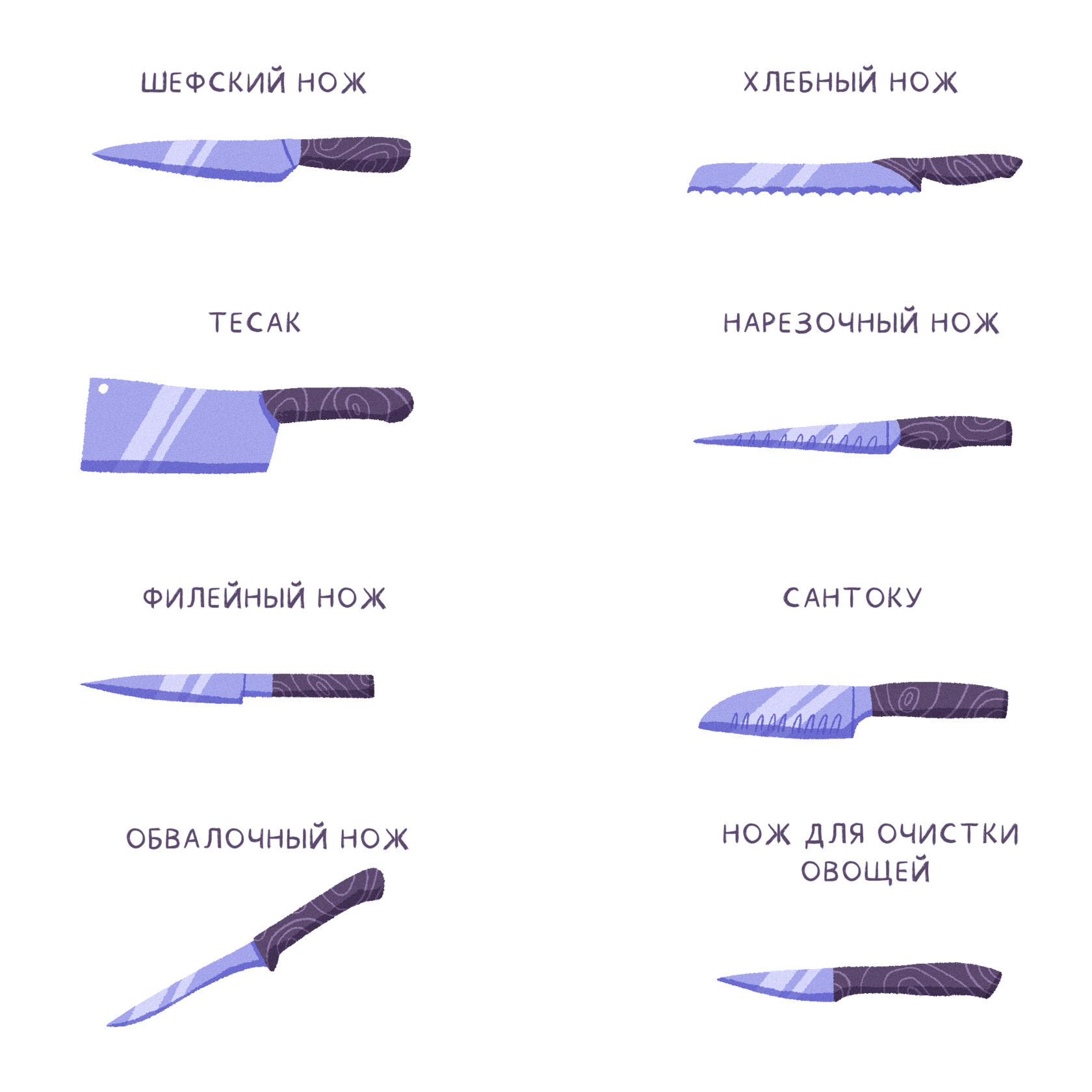 Универсальный нож. Подойдёт для всего: от очистки фруктов и овощей до нарезки и измельчения. Этот нож сочетает в себе особенности своих коллег. Он подойдёт для нарезки любых продуктов, но будет не так эффективен, как вышеперечисленные ножи для конкретных случаев.