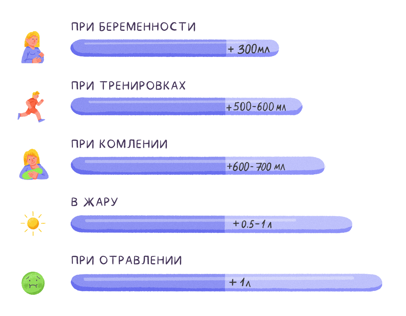 Во время кормления грудью лучше превысить норму на 600−700 мл в день, это нужно для молока, которое на 87% состоит из воды.