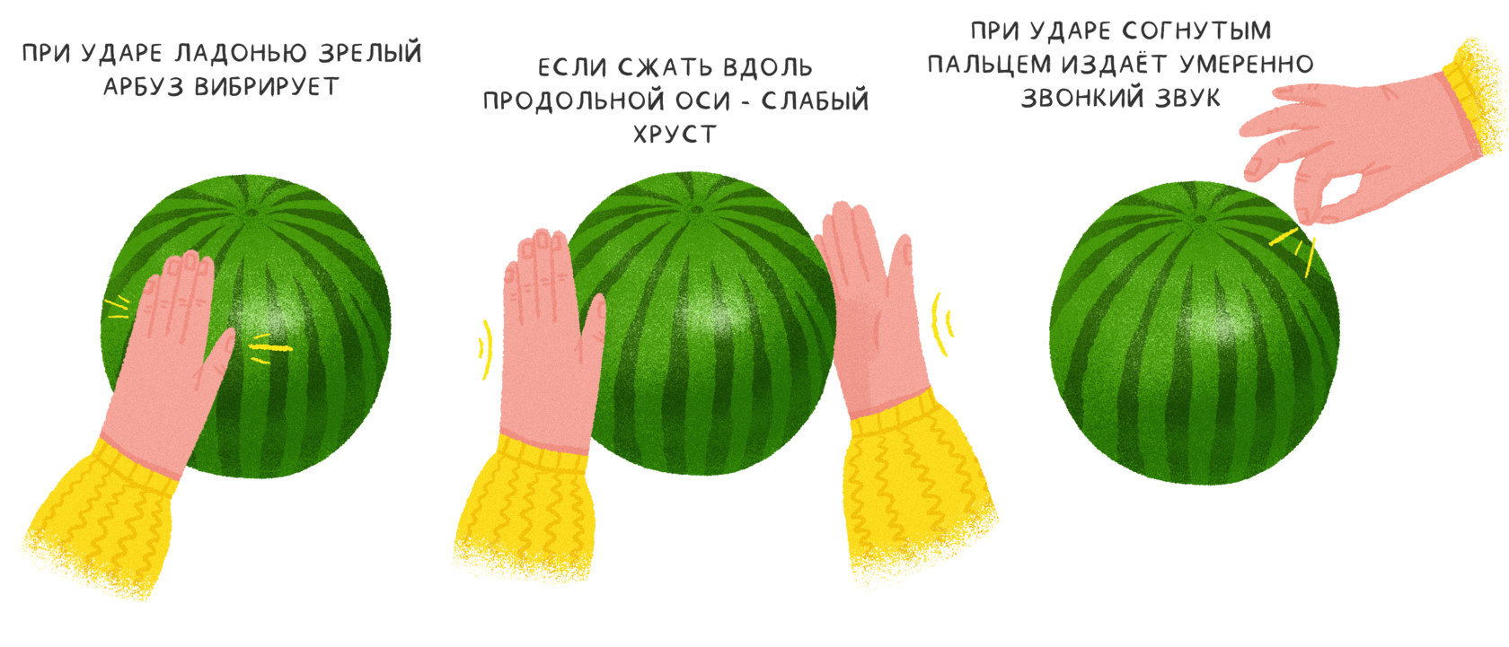 Не стоит выбирать слишком большие арбузы, более 10 кг — такие чаще всего не успевают дозреть. Также некоторые продавцы специально накачивают их водой для увеличения веса. Самые сочные плоды обычно чуть больше среднего размера — от 5 до 10 кг. Но это зависит от сорта и региона произрастания. Часто мякоть у спелого плода имеет более низкую плотность, поэтому он будет весить меньше.