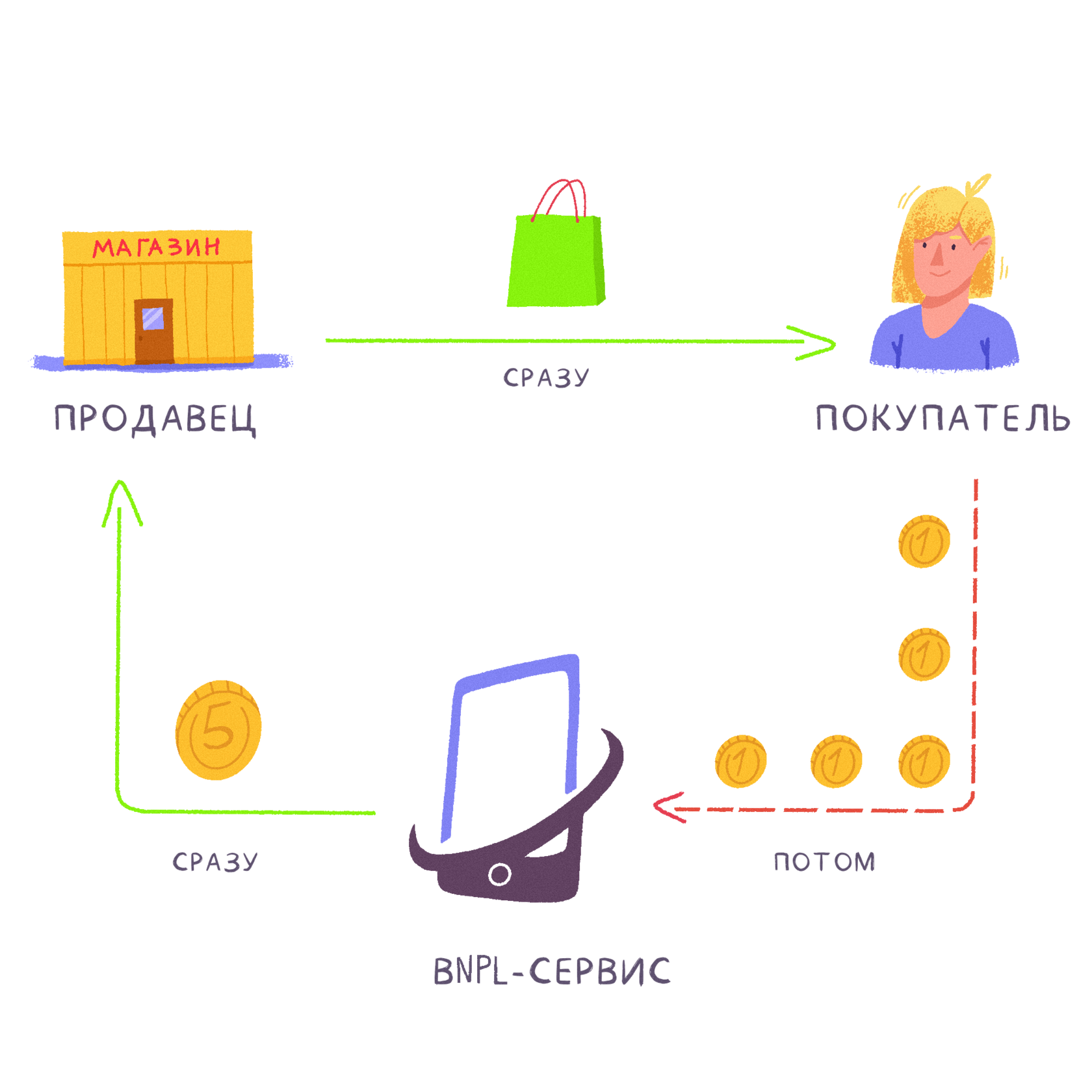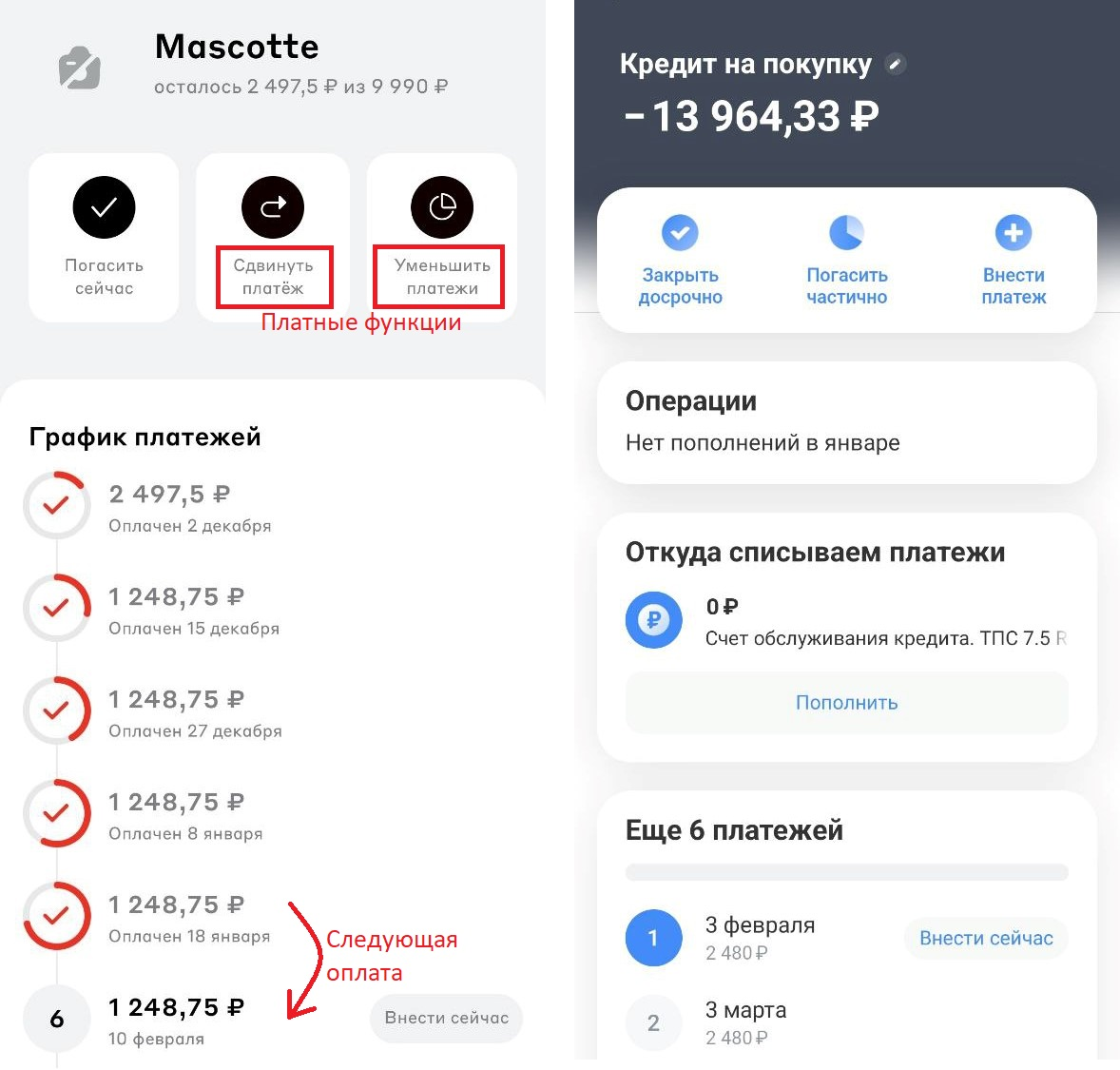 ; «Сплит», Яндекс; «Долями», Тинькофф- банк; «Подели», Альфа-банк; «Плати частями», Сбер; «Плайт» (бывшая «Халва частями»), Совкомбанк;
