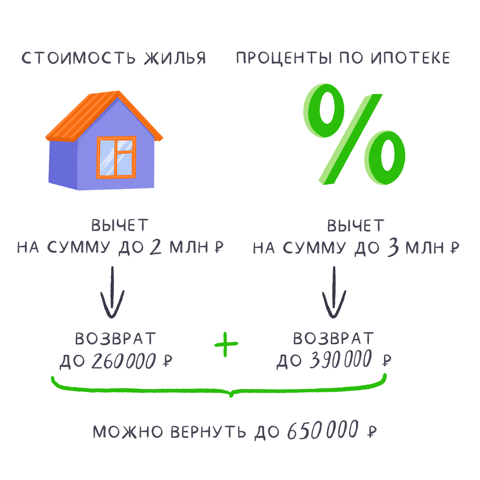 Каждый россиянин за жизнь может вернуть в сумме до 260 000 рублей в виде вычета за покупку или строительство жилья. Пока лимит не исчерпан, можно получать вычеты сколько угодно раз.