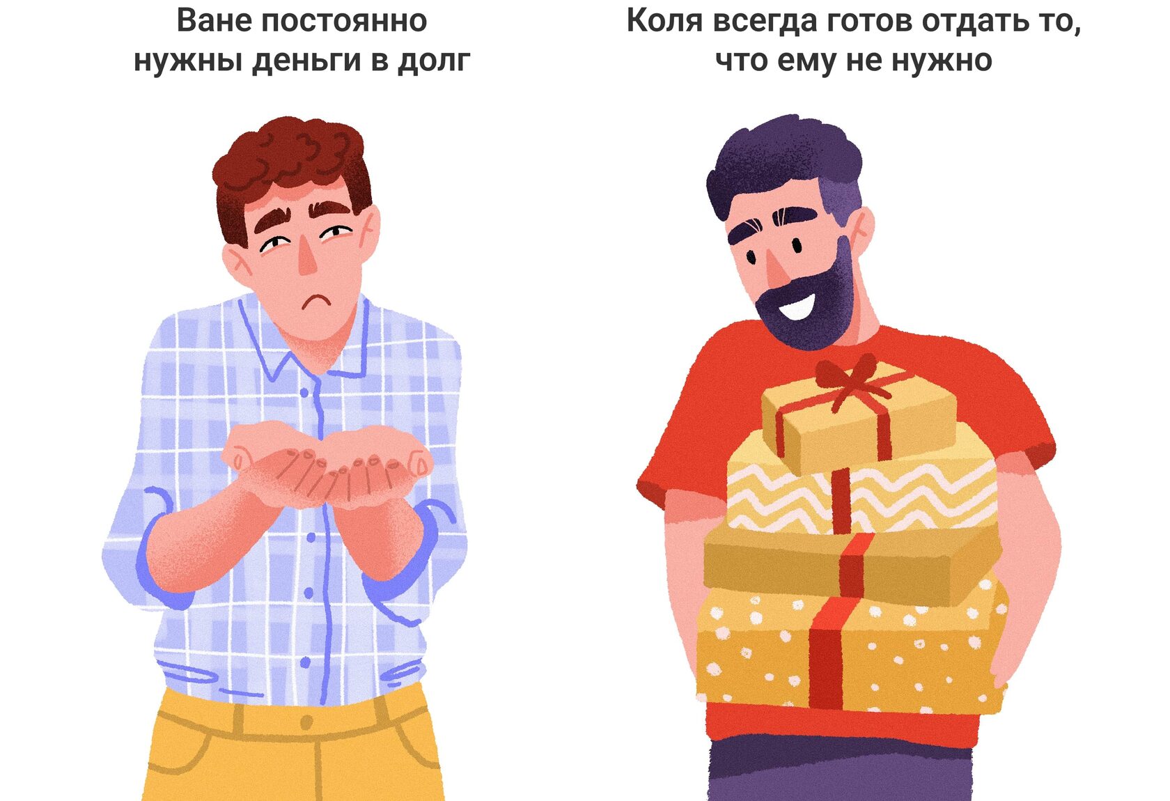 Есть Ваня — он постоянно покупает себе одежду. Из-за этого ему даже приходится брать кредиты и брать в долг у друзей. И это явно не улучшает их общение.