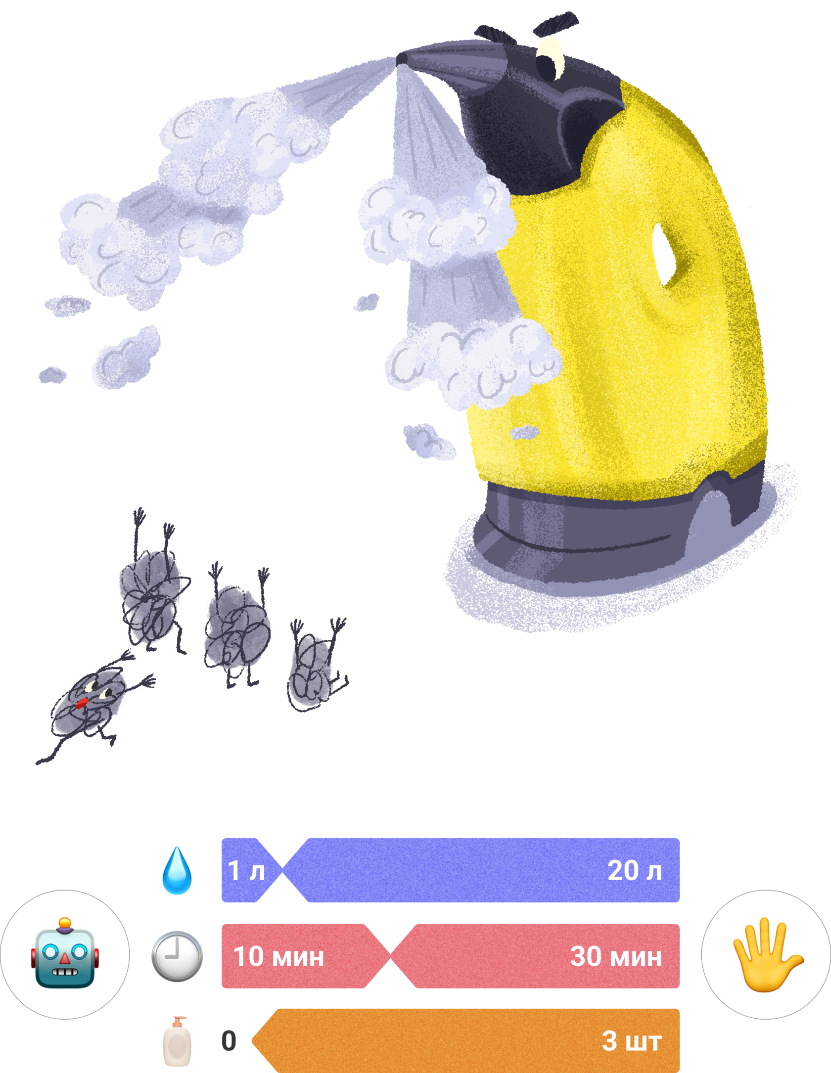 Для пароочистителя нужна только вода. Горячая струя пара сама разрушает грязь, жир и пятна. Обычно расход моющего средства рассчитывается из соображений 10 мл на 1 м², то есть литра средства для мытья пола и других поверхностей хватит на 100 м². А ведь нужны ещё средства для мытья сантехники, стёкол и зеркал.