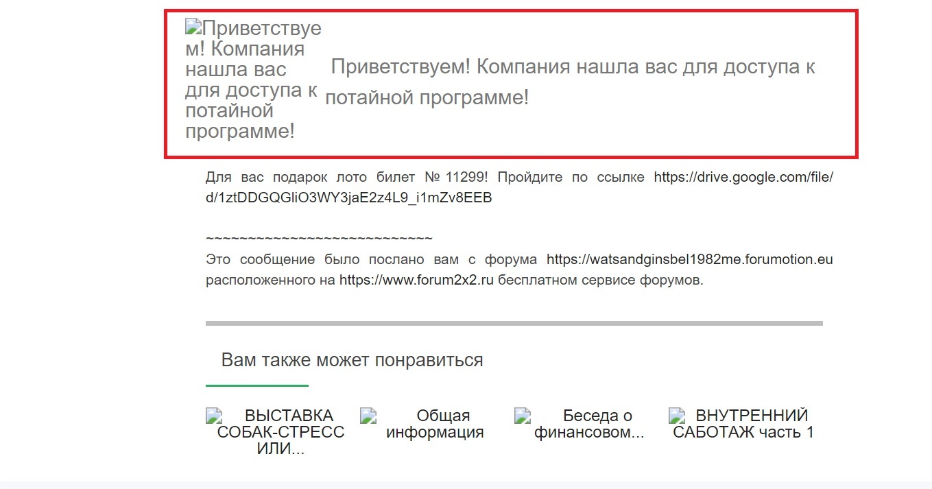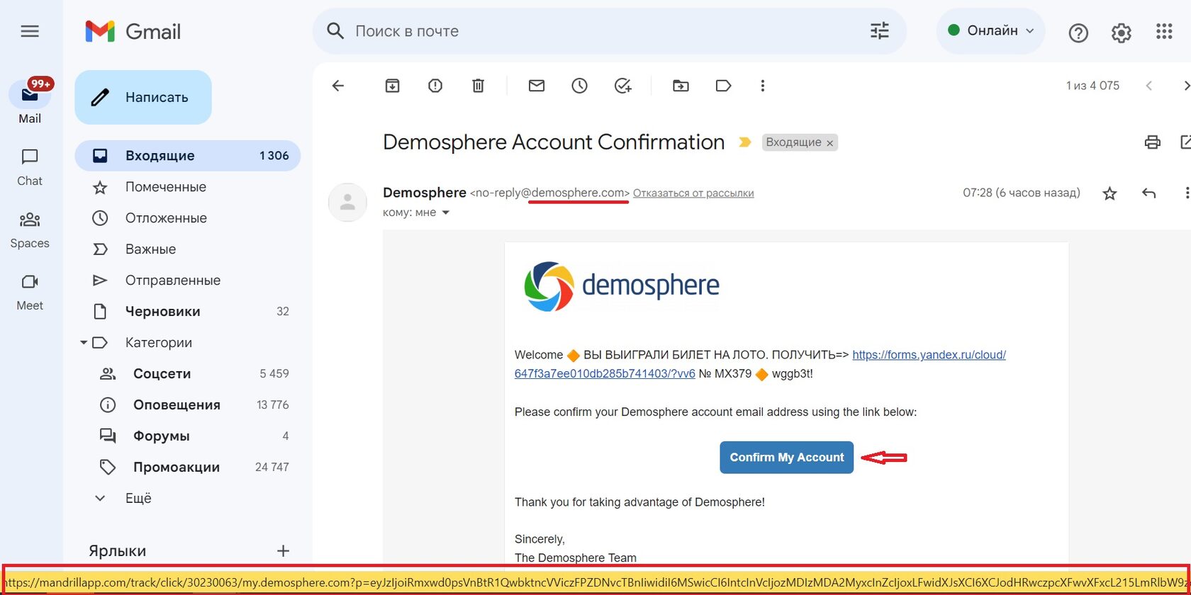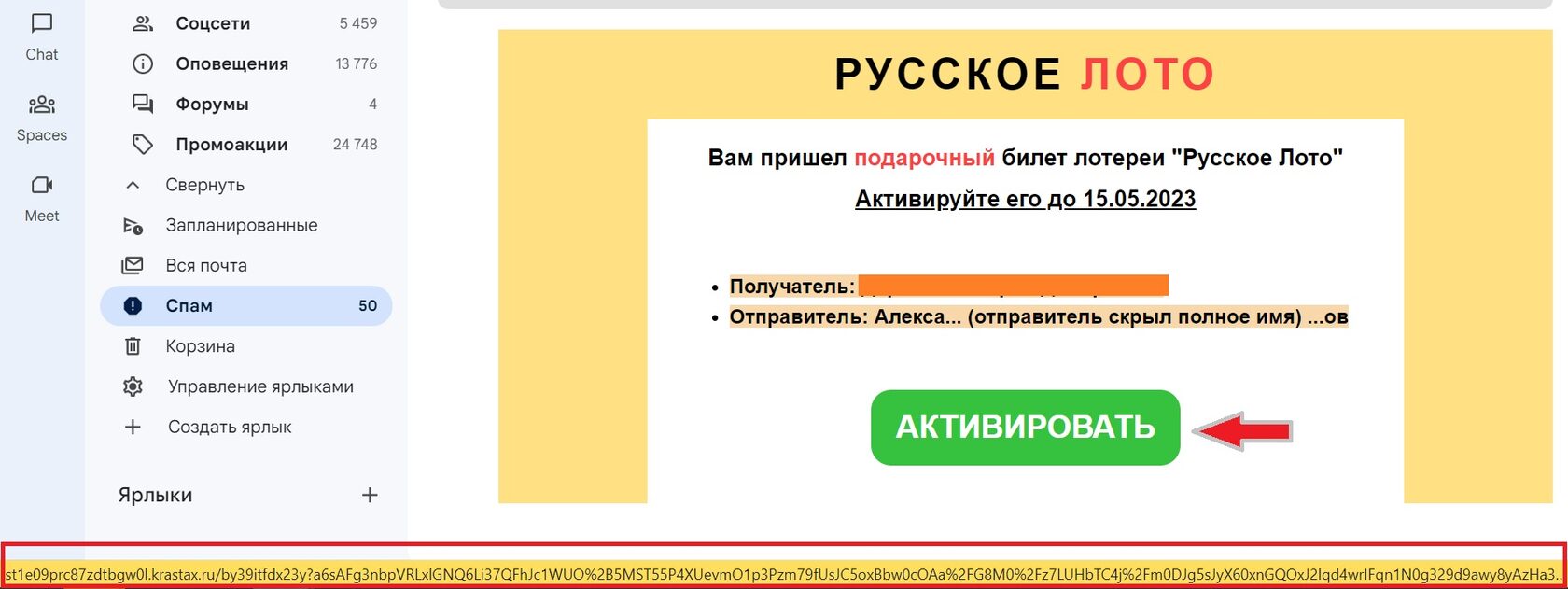 Здесь мошенники пытались замаскировать себя под «Русское лото». Если навести на кнопку, внизу появится строка с ссылкой — она выглядит уж очень длинной и никак не совпадает с названием официального сайта «Русского лото».