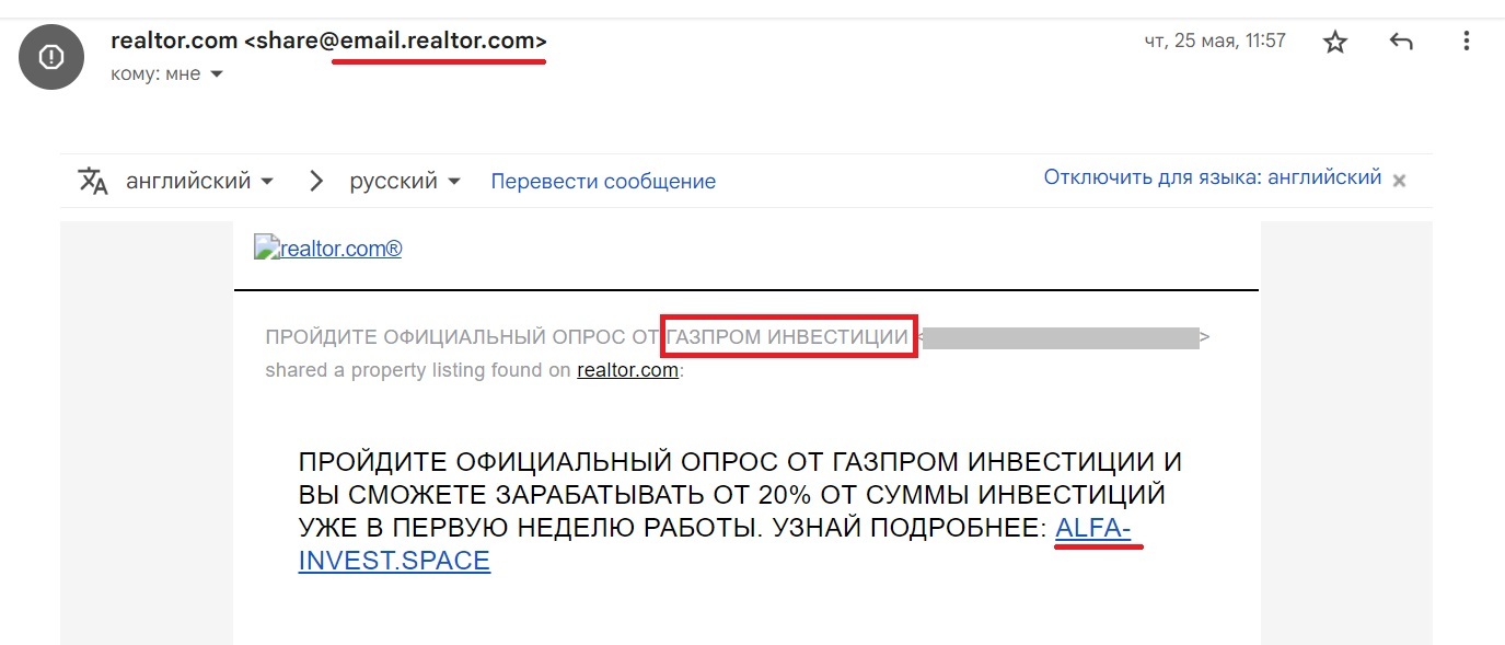 Например, на скриншоте ниже мошенники с непонятным email-адресом хотели представиться Газпром Инвестициями.